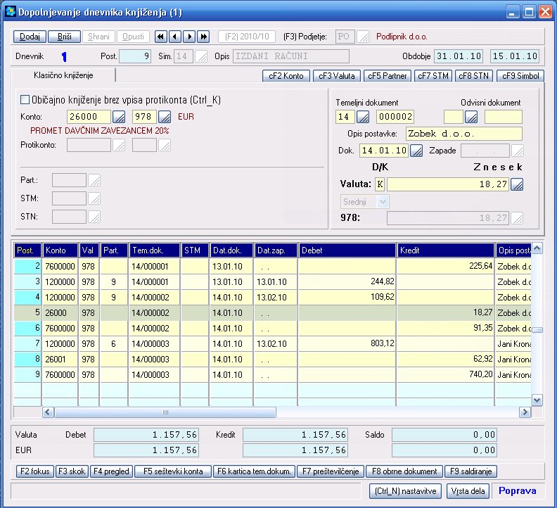 Knjiženje postavk se izvaja avtomatično preko knjig DDV ali neposredno v dnevnike knjiženja, ki jih je lahko znotraj enega obračunskega obdobja (meseca) več in se vsak dan dopolnjujejo. Posamezni dnevniki knjiženja so razdeljeni po vrstah prometa, kar omogoča manjše dnevnike in večjo preglednost v okviru kronološkega spremljanja poslovnih dogodkov.